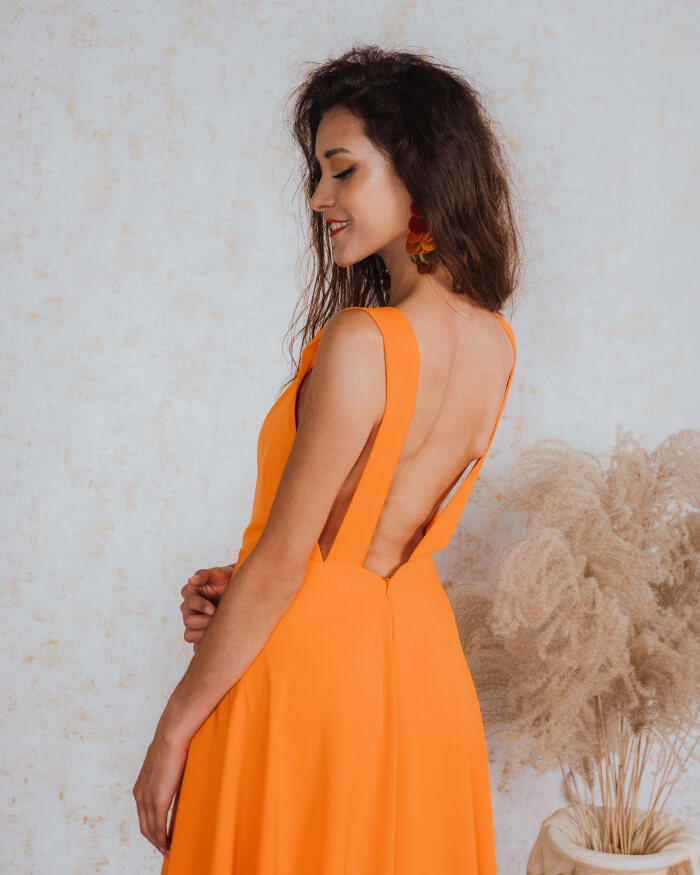 Sukienka Charlotte uszyta jest z półkola, dzięki czemu pięknie układa się podczas poruszania się. Długość 7/8 zapewnia komfort noszenia, a mocno wycięte plecy pięknie podkreślą Twoją figurę. Lejący się dekolt dodaje sukience lekkości, dlatego świetnie się sprawdzi na letnie przyjęcia.